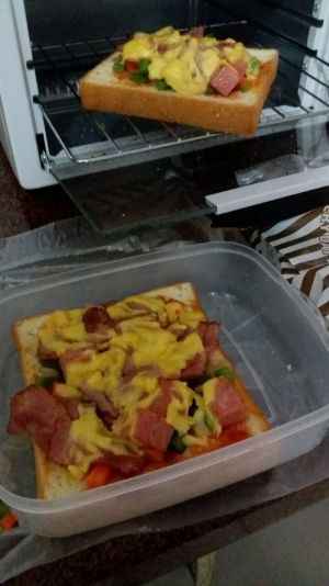 烤箱预热200度,把做好的火腿培根吐司披萨放入烤箱烤8分钟。