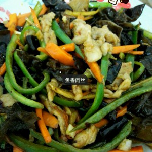 用余下的油,加入姜丝,蒜泥,炒出香味后, 加入一勺辣椒酱,胡萝卜丝翻炒,中到大火,倒入一勺料酒,两勺糖,两勺陈醋,倒入青椒丝,木耳丝翻炒……