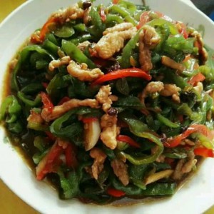倒入切好的青红椒翻炒,倒入炒好的肉丝,依次放调料,料酒,老抽,生抽,耗油,黑胡椒粉,盐,鸡精,炒到青红椒略软即可盛出装盘。撒上点葱花点缀ok