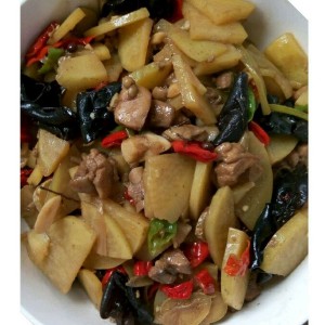 加土豆,木耳,翻炒。加水,焖一会儿。土豆变半透明,放辣椒,继续翻炒。熟了以后,放盐,鸡精,味精适量。(想吃绵软的土豆可以多焖一会儿)。