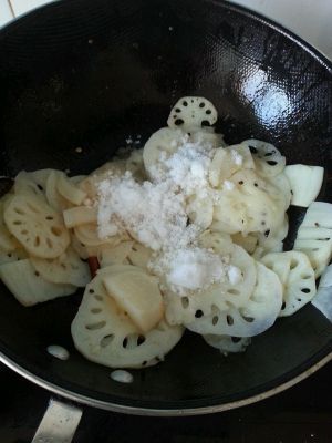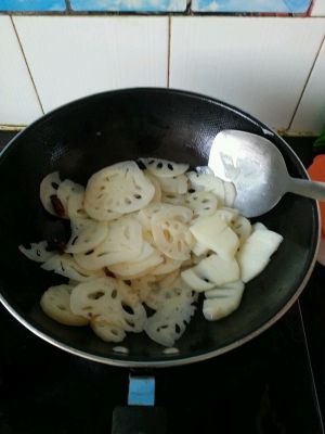 待编出香味后放入藕片翻炒!