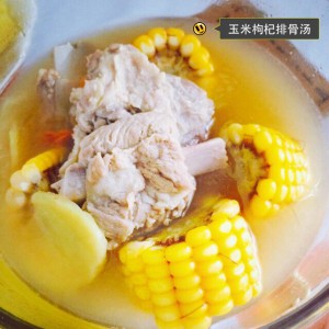 锅里加水,放入切成小段的玉米,葱段,姜片,枸杞,排骨。煮两个小时。临出锅加入盐。
