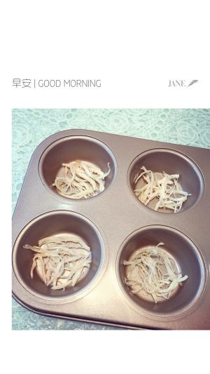 菠菜、香菇、红萝卜丁先炒熟,鸡胸肉先铺于模具底部。
