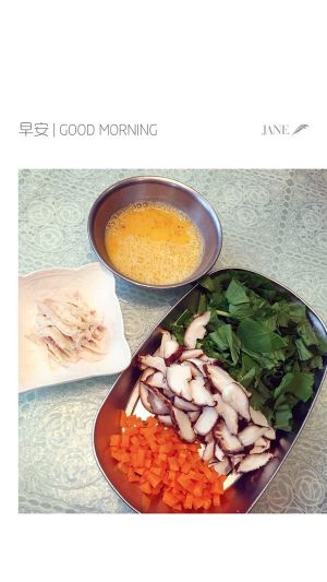 所有材料切好备用,鸡胸肉煮熟撕条状,鸡蛋液加入盐、黑胡椒、白胡椒粉搅拌均匀。