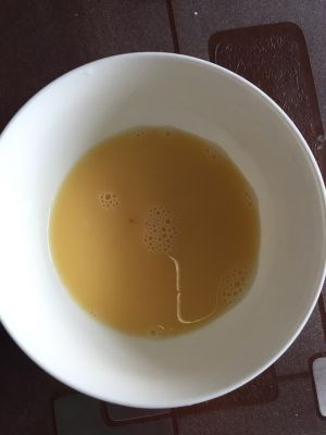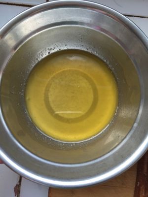 鸡蛋液打散后,把黄油混合液倒入,充份搅拌均匀