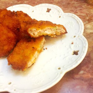 面粉里放少许盐和胡椒。馅料先捏成饼。粘面粉,蛋液,面包糠。