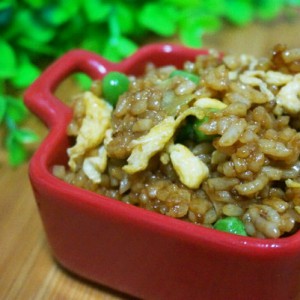 拌匀后的米饭中放入豌豆拌匀(豌豆需要提前在热水中焯三分钟)