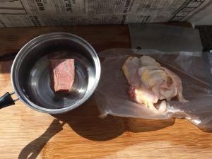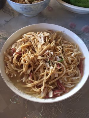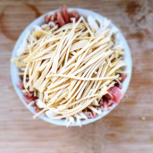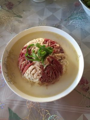 准备金华火腿一块,鸡胸脯肉煮熟,用鸡架吊汤,同时切两片火腿一起吊汤