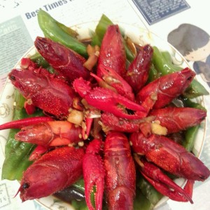 油锅入姜片红尖椒大蒜爆香倒入龙虾翻炒,倒入老抽,盐糖调味,香叶水漫过小龙虾,中火烧半小时,出锅前五分钟倒入青椒