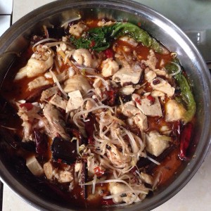 将煮好的鱼肉和汤一起倒入有金针菇的盆里,放入生菜,放花椒干辣椒,重新热油倒入锅中激出香味即可。