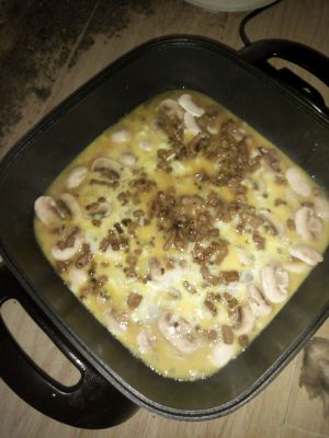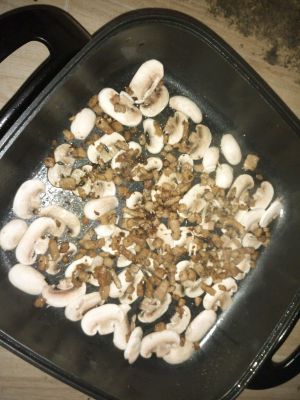 放入另一锅中翻炒,等到肉完全熟了再将肉丁铺在口蘑上边
