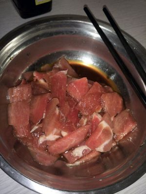 将肉切成小丁,加入料酒,酱油腌制五分钟,没有小丁的图,就拿这个图凑数啦(><)