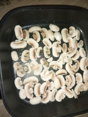口蘑切成薄片,在不粘锅中均匀的刷一层油,放入口蘑,锅控制在中温