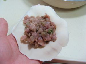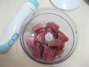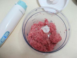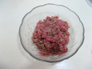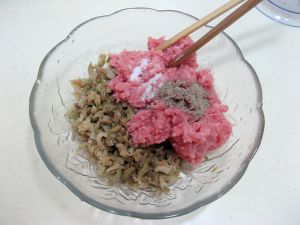 榨菜切成大丁,与猪肉馅同入一碗中,根据口味调入适量盐、黑胡椒粉、植物油