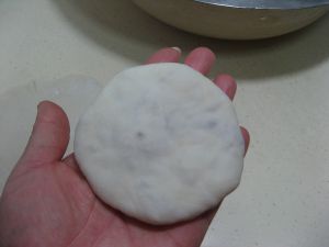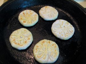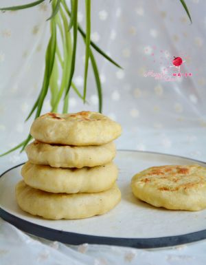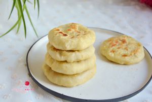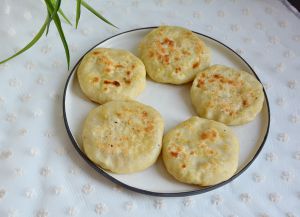 待馅饼底面定型后,翻身,小火盖盖子,焖几分钟,中途可翻身两次,待两面金黄,饼身鼓气,便可出锅