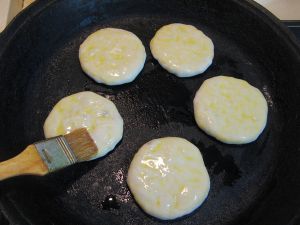 饼铛上灶,中小火烧热,用刷子在锅面上稍微刷一点油,将馅饼带褶的一面朝下铺摆在锅中,用刷子在馅饼上轻刷一层油