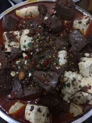 锅热放油,加入葱姜翻炒片刻加入猪血翻炒片刻加入酒、老干妈、盐翻炒均匀后倒入水(和猪血平齐)水开后炖一会儿倒入豆腐炖至汤汁浓稠即可