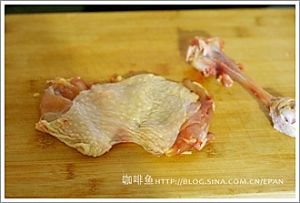 鸡腿剔骨,在鸡肉一面用刀划几下,方便入味;
