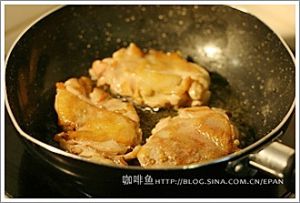 锅中放少许油,鸡皮面朝下,煎出多余的鸡油;