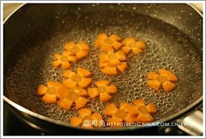 胡萝卜切片,用刀改花形,焯水后过凉水备用;