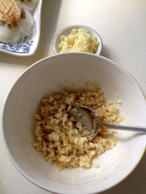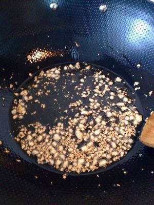 热锅冷油,余下蒜蓉、中小火、炒制金黄色。
