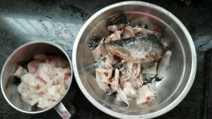 将洗好的雨沿中间主骨分两半,鱼肉斜刀片成鱼片,鱼头鱼骨鱼皮切段。分两个容器装好待用。