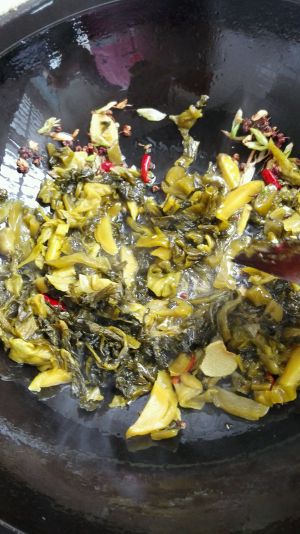 油锅烧热放入姜片,花椒,干辣椒爆香。放入切好的酸菜继续翻炒大概3分钟。