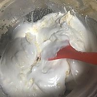 在蛋白霜里加入蛋黄糖浆,慢速打匀后再筛入低粉