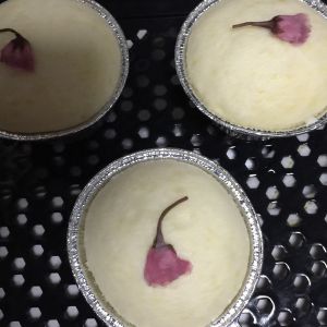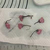 盐渍樱花提前浸泡过夜后捞出用厨房纸巾吸干水分后小心放在面糊上