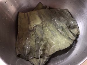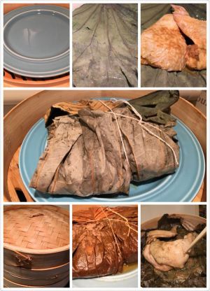 将一个盘子放入蒸笼或蒸锅,放上荷叶再放入腌渍好的鸡用棉线扎紧盖上盖子大火蒸45分钟后关火再闷5分钟即可。如果怕蒸不熟拿跟一根筷子戳入最肥处没有流出粉色的汁就表示熟了。