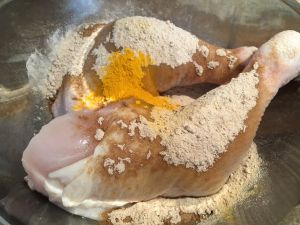 我是用整鸡切下鸡腿跟鸡翅来做这一道菜的,余下的鸡胸、鸡架还可以煲汤。没有整鸡的请用鸡腿、鸡翅就可以,感谢朋友特地从台湾带回来的现磨姜黄,使这道菜颜色味道更好!