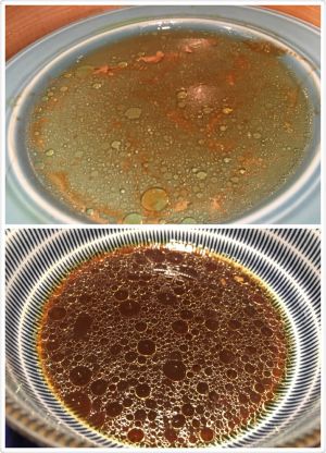 将蒸下来的鸡汤倒入碗中,加入生抽、醋、麻油,喜辣的亲可以再添加辣椒油哦!这样蘸料就做好了。酱汁的浓度大家按自己的口味添加,没有标准。