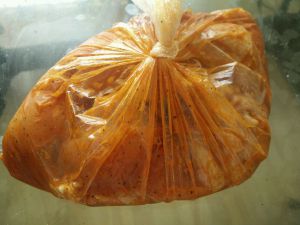 将翅根和调味汁共同倒入干净的塑料袋中,摇匀后放入冷藏室2个小时以上,我一般都是晚上放入隔天中午做,更入味。
