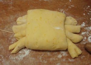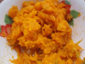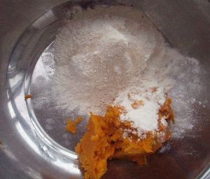 面粉,酵母,和南瓜放在一起,准备和面(建议南瓜分次加入,因为水分很多)