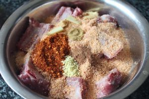 排骨切寸段洗净放入容器,加入葱段和姜片、盐、辣椒面、花椒面、胡椒面、料酒、生抽、鸡精等调料和米粉抓匀腌制30分钟。