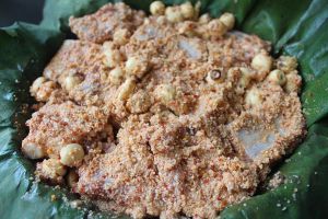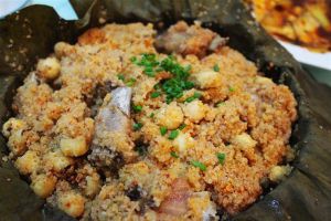 将排骨连同莲子摆在莲藕之上,包上荷叶中火蒸1小时至排骨酥软。