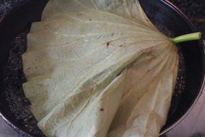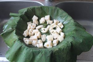 将荷叶铺入蒸屉中,底层码放一层莲藕块。