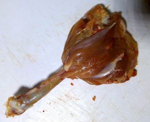 下半部分用厨房剪刀贴着骨头伸进去,剪断筋和皮肉附着在骨头上的部分,保留肉的完整,将剪好后的肉翻过来,形成一个空花苞的形状