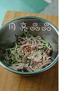 黄瓜丝肚丝和大蒜都放大盆里,放盐、鸡精、一点点白糖、滴几滴米醋,拌匀后装盘,淋上一勺辣椒油,吃时拌开。