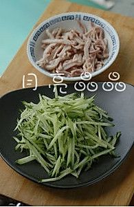 黄瓜浸泡清洗干净、连皮切成丝,熟猪肚切丝,大蒜拍碎切末。