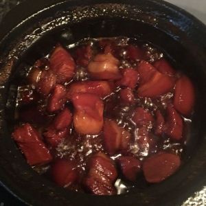 炒糖色。将炒锅微微烧热,倒入适量食用油,加入冰糖小火煸炒。