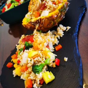 在菠萝里乘入一部分饭 在在外面撒一些 效果杠杠滴啊