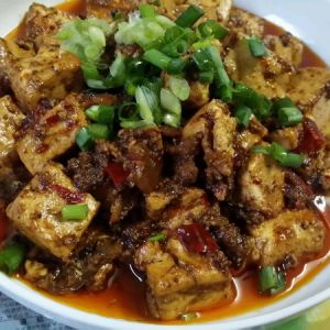 过程图确实没有了,最近做的时候没照,成品图是用的胆水老豆腐做的,锅里下油先炒香肉沫,再放入老抽及郫县豆瓣,姜蒜末放入炒香后倒入豆腐,可以稍微加一点点水进去闷豆腐,待快收汁的时候加入鸡精及花椒粉辣椒面,水淀粉稀释后倒入锅中勾芡,撒上葱花起锅装盘,一道麻婆豆腐就完成了。