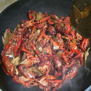 放入小龙虾一起爆炒,闷至入味,加入配菜,起锅