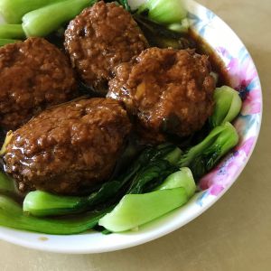 捞出肉丸子们摆盘到上海青上,最后淋汁。