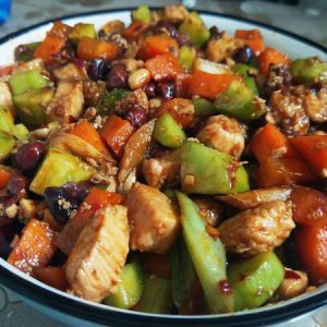 倒入胡萝卜丁翻炒,加入鸡肉丁;
