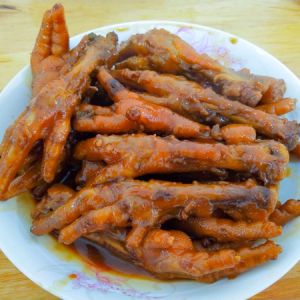 起锅热油,油开下葱姜蒜,八角桂皮那些料炒香,然后放冰糖,小火炒冰糖融化,再加入鸡脚炒一分钟,然后加酱油,蚝油,生抽,一勺盐,最后加水,大火至水开转小火炖30分钟,最后大火收汁。