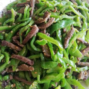 植物油烧熟后,放入牛肉丝爆炒,放入熟芝麻(*^ω^*)