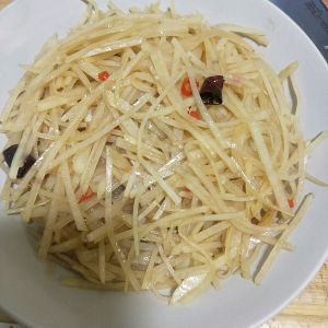 快速放醋,能保证土豆丝的香脆,不会变得很面,翻炒后加盐,海鲜酱油继续翻炒30秒左右出锅,因为焯过水所以土豆丝很容易熟。