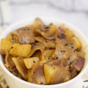 碗里盛饭,盖上肥牛卷。一碗土豆肥牛饭就完成了